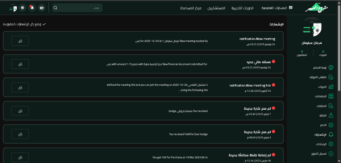 تُعد الإشعارات في منصة مشروع العمر أداة أساسية لإبقاء المتعلمين على اطلاع دائم بكل ما يخص دوراتهم التعليمية. وتشمل هذه الإشعارات تنبيهات حول الاجتماعات الجديدة، والوثائق المالية، وروابط الدخول إلى الاجتماعات، والشارات المكتسبة، وإضافة النقاط. كما تتيح المنصة للمتعلم إمكانية التحكم في إعدادات الإشعارات بسهولة لضمان تلقي التنبيهات التي يحتاجها فقط.