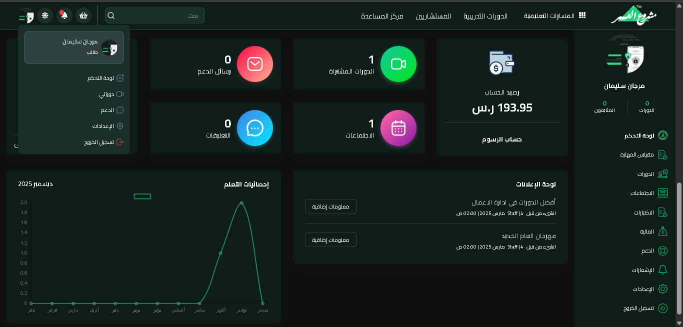 لوحة تحكم الطالب في مشروع العمر مصممة لتجمع كل ما تحتاجه في مكان واحد: دوراتك، أموالك، تقدمك، وإشعاراتك. الأرقام والتحديثات تظهر بشكل لحظي لتسهيل اتخاذ قرارك والتركيز على التعلم.