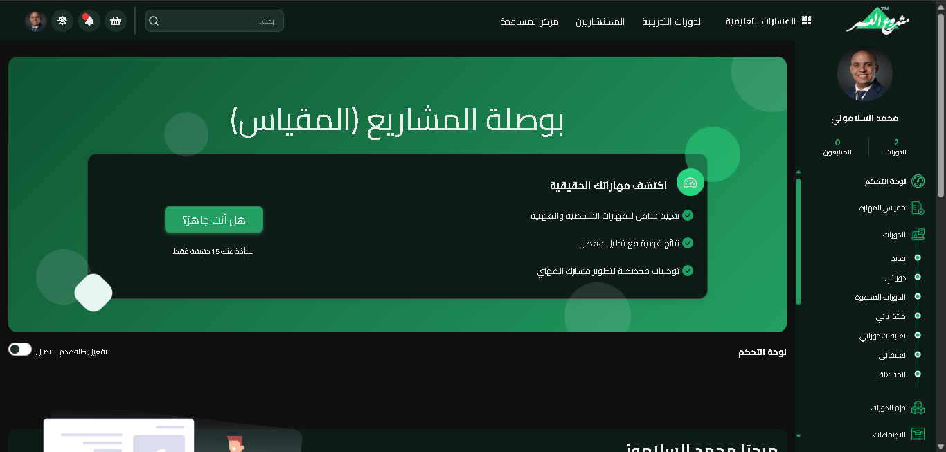 بعد تسجيل الدخول إلى منصة مشرعلم، يصل المعلم إلى لوحة التحكم الرئيسية التي تحتوي على جميع الخيارات المتاحة له.