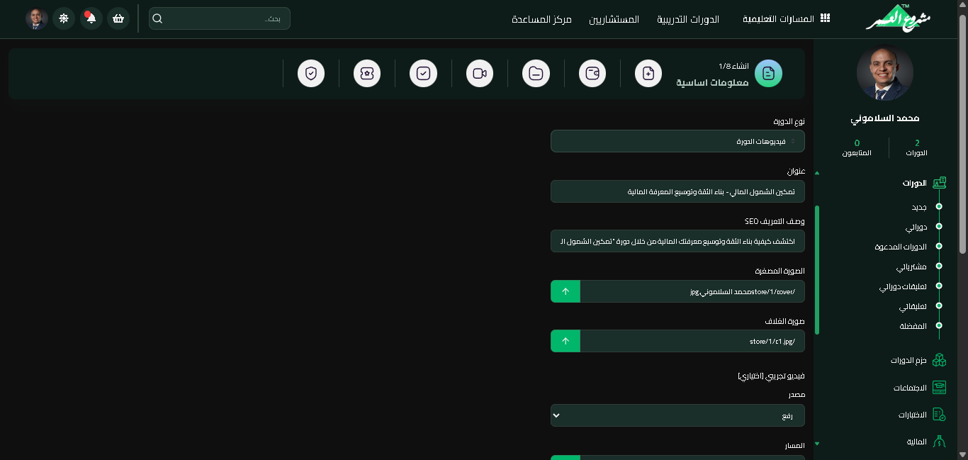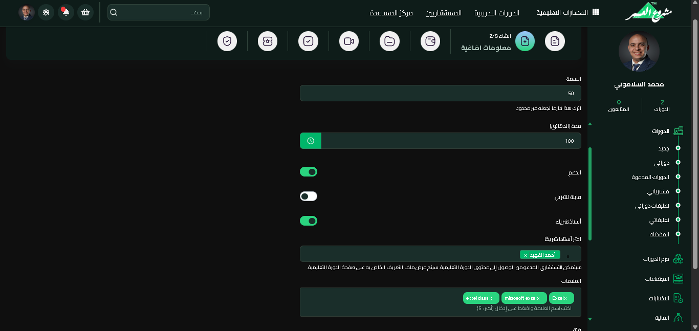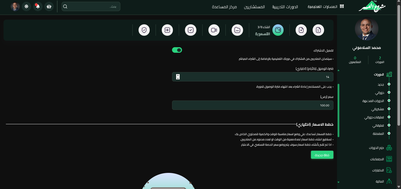 بعد النقر على "إنشاء كورس جديد"، ينتقل المعلم إلى صفحة إعدادات الكورس حيث يقوم بتعبئة جميع البيانات الأساسية.
