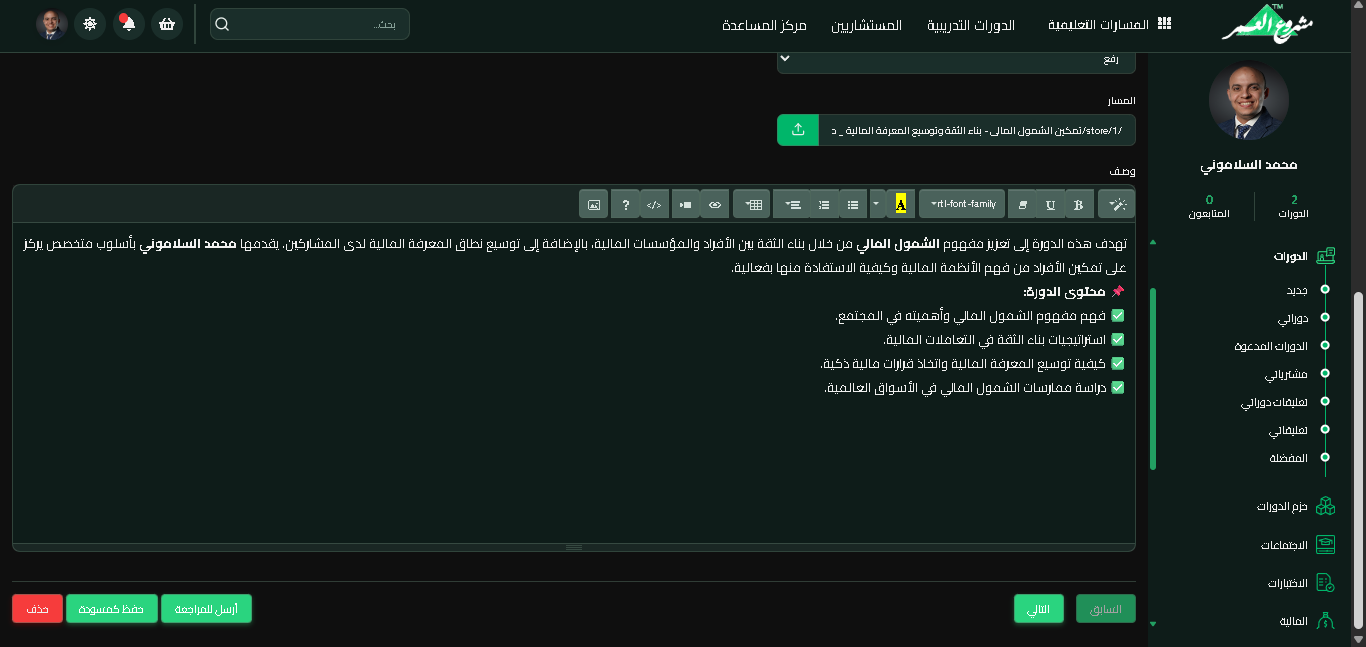 باتباع هذا الدليل خطوة بخطوة، يستطيع أي معلم إنشاء كورس تعليمي احترافي في منصة مشرعلم خلال وقت قصير. المنصة توفر جميع الأدوات اللازمة لرفع المواد التعليمية المختلفة، إنشاء الاختبارات والواجبات، ومتابعة تقدم الطلاب بسهولة ويسر.
