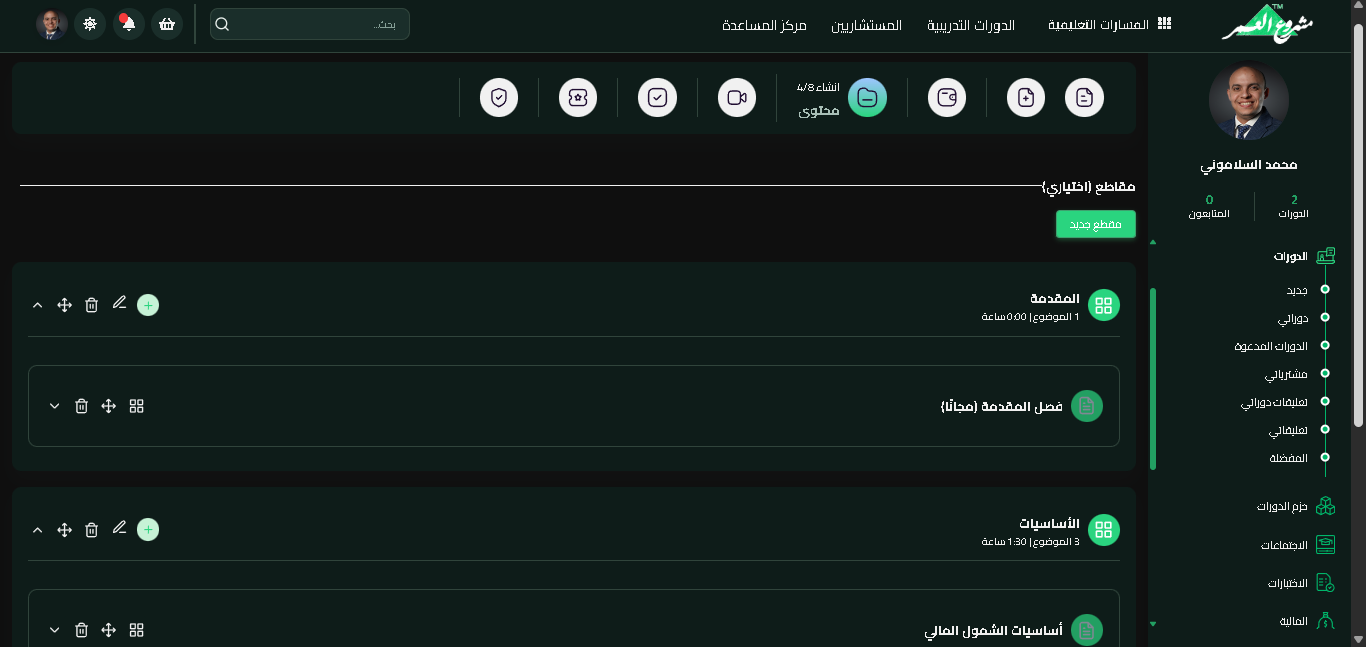إدارة الأقسام والدروس صفحة إدارة محتوى الكورس