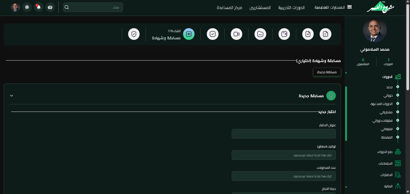 - لإنشاء كورس جديد، انقر على زر "إنشاء كورس جديد" الموجود في أعلى الصفحة