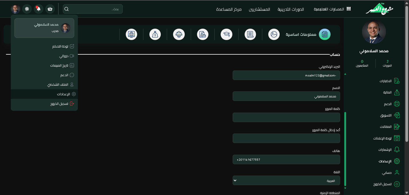 | السيرة الذاتية (البايو) | اكتب نبذة مختصرة عن نفسك (من 50–300 حرف) | بتظهر تحت اسمك في صفحة الكورسات |
