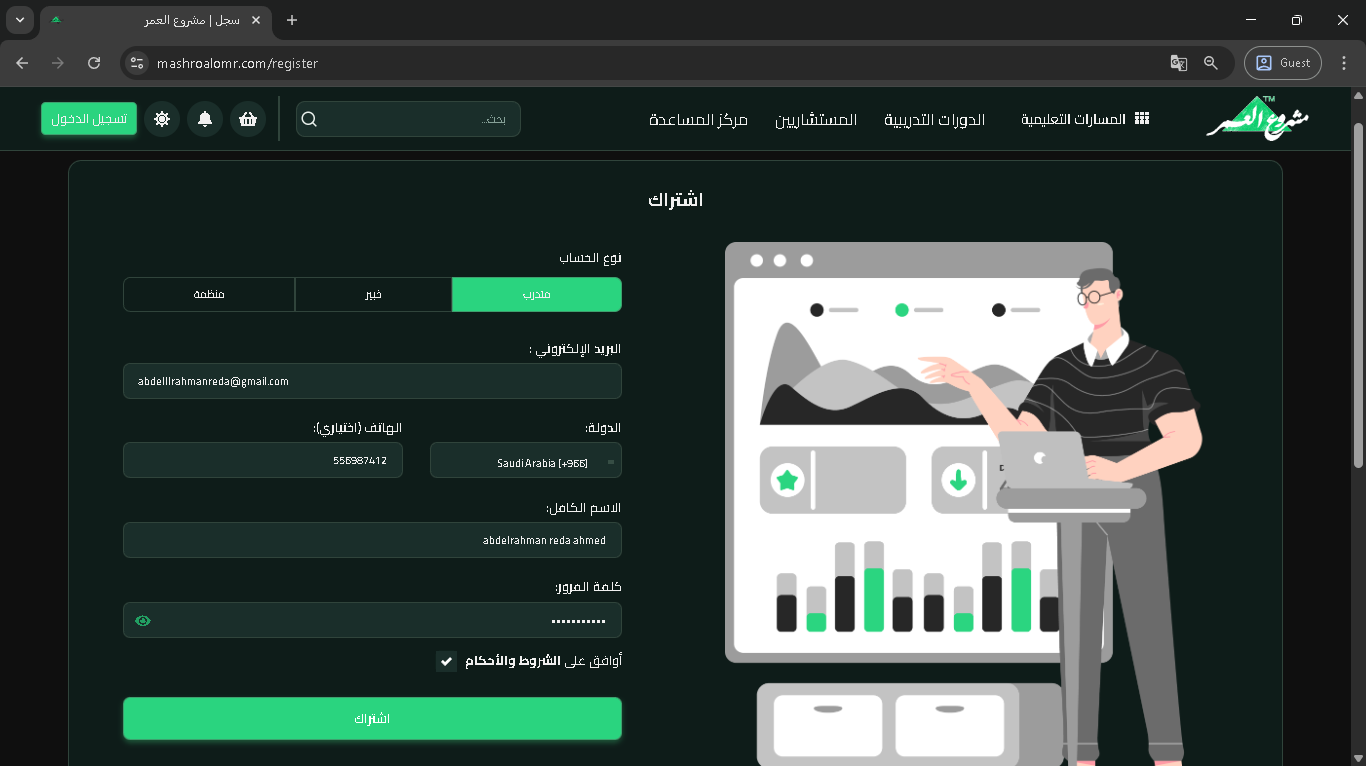 حتى تتمكن من استخدام منصة مشروع العمر والاستفادة من الخدمات المتاحة، يجب أولًا إنشاء حساب جديد. في هذه الصفحة يمكنك اختيار نوع الحساب المناسب لك سواء كنت طالبًا، خبيرًا، أو منظمة، ثم إدخال بياناتك الأساسية لإتمام عملية التسجيل.